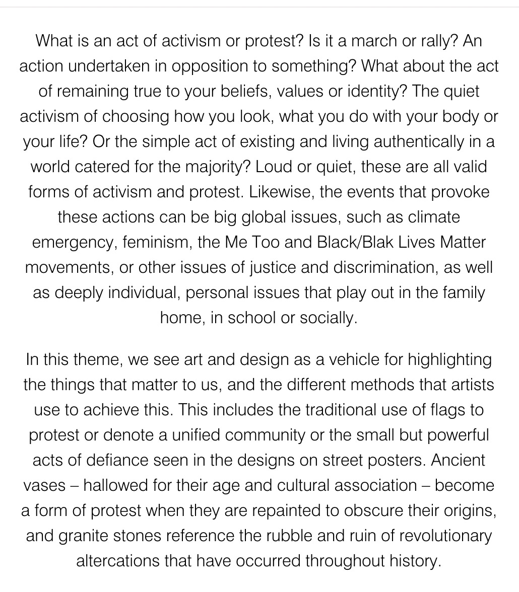 • The following extract from the NGV’s own website displays an absurd level of hypocrisy. This also provides an example (albeit a cartoonishly unsophisticated one) of the way in which a western imperialist cultural institution will inevitably mobilise to capture, absorb, aestheticise, commodify, and ultimately subdue any uprising for collective liberation: