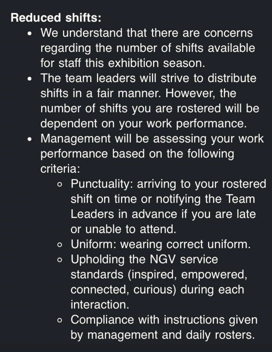 The following points have been gathered from my conversations with many National Gallery of Victoria (NGV) staff members, who I am choosing to anonymise.